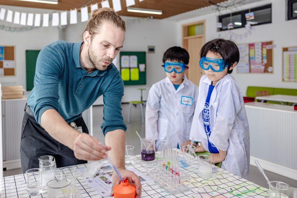 Various activities were arranged for the children. A highlight was a science experiment with red cabbage juice, where young researchers tested whether common household substances—such as lemon juice or baking soda—acted as acids or bases. The students conducted these experiments themselves in a workshop led by the school’s STEM department and were amazed by the vibrant results.