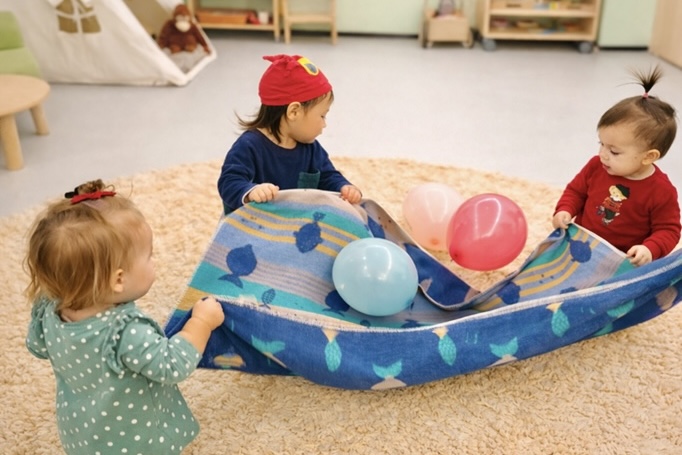 Movement is also an integral part of our daily routine. Through dancing, playing with scarves and balloons, and guided physical activities, children experience their bodies, strengthen coordination, and discover the joy of moving together.Stories, color games, and role play further connect language, sensory awareness, and emotional development.