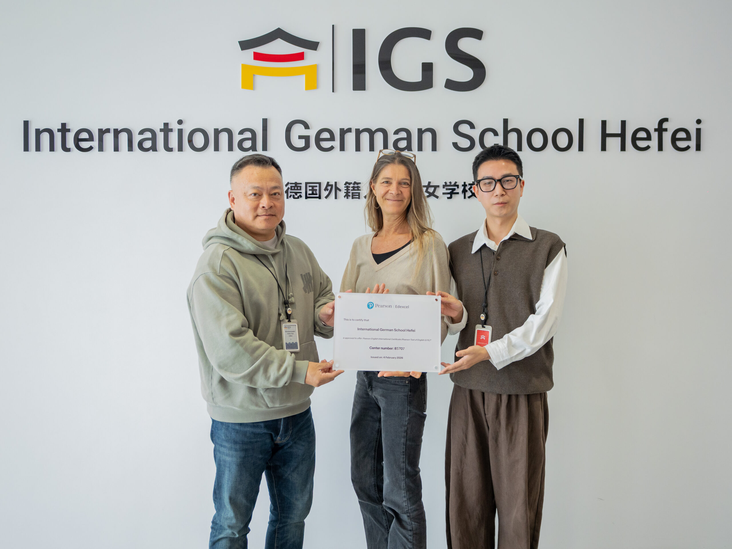 Am 20. März fand an der IGS die feierliche Akkreditierungszeremonie für das Pearson PEIC International Assessment Centre statt. Zu den anwesenden Gästen zählten Heide Schaffer, Schulleiterin, Jessie Wu, Executive President der Schule, Hongwei Ci, General Manager des Pearson English International Certification Examination Service Centre, sowie Scotty Yuan, Business Manager der PTE-Region Zentralchina.