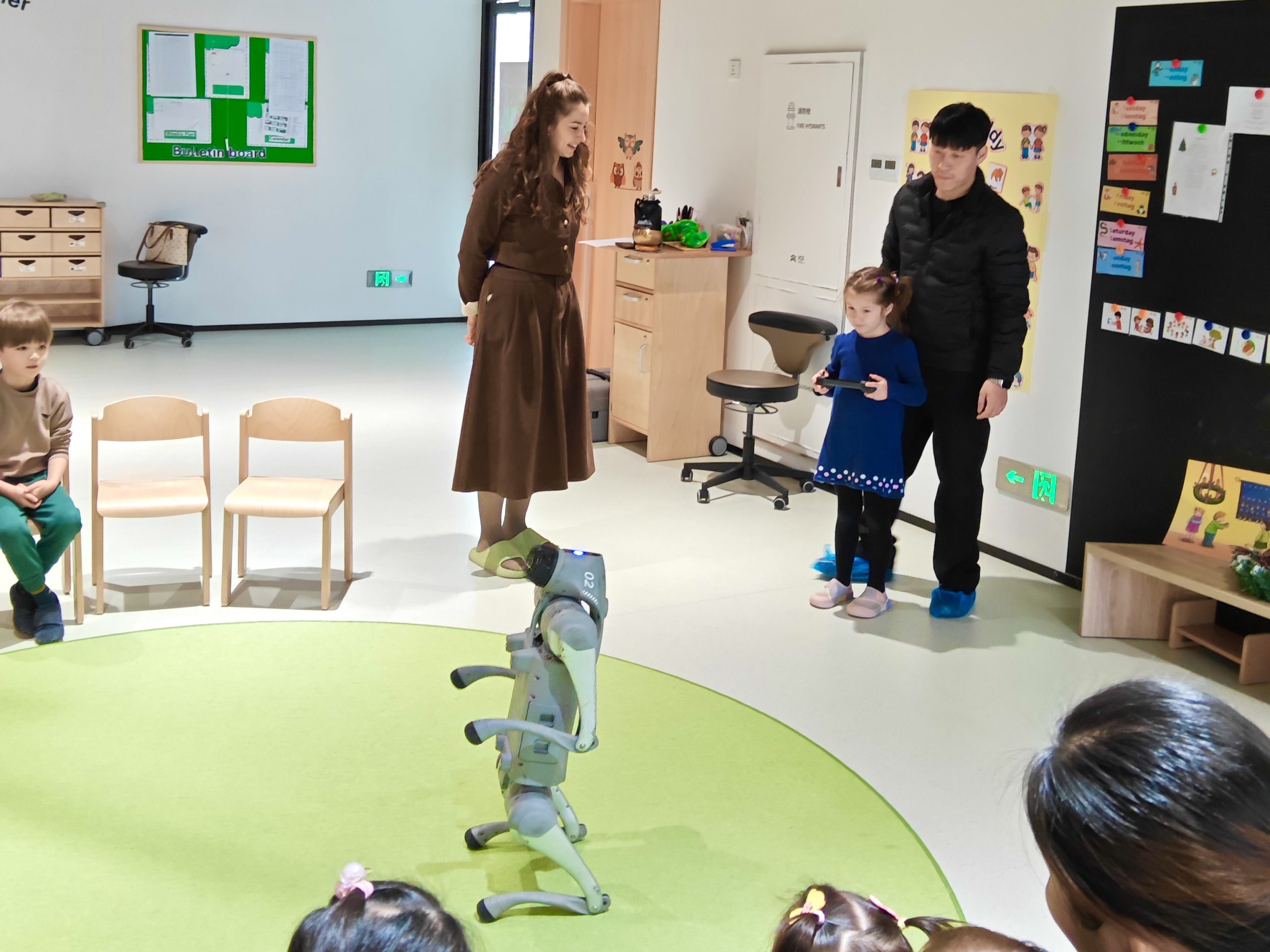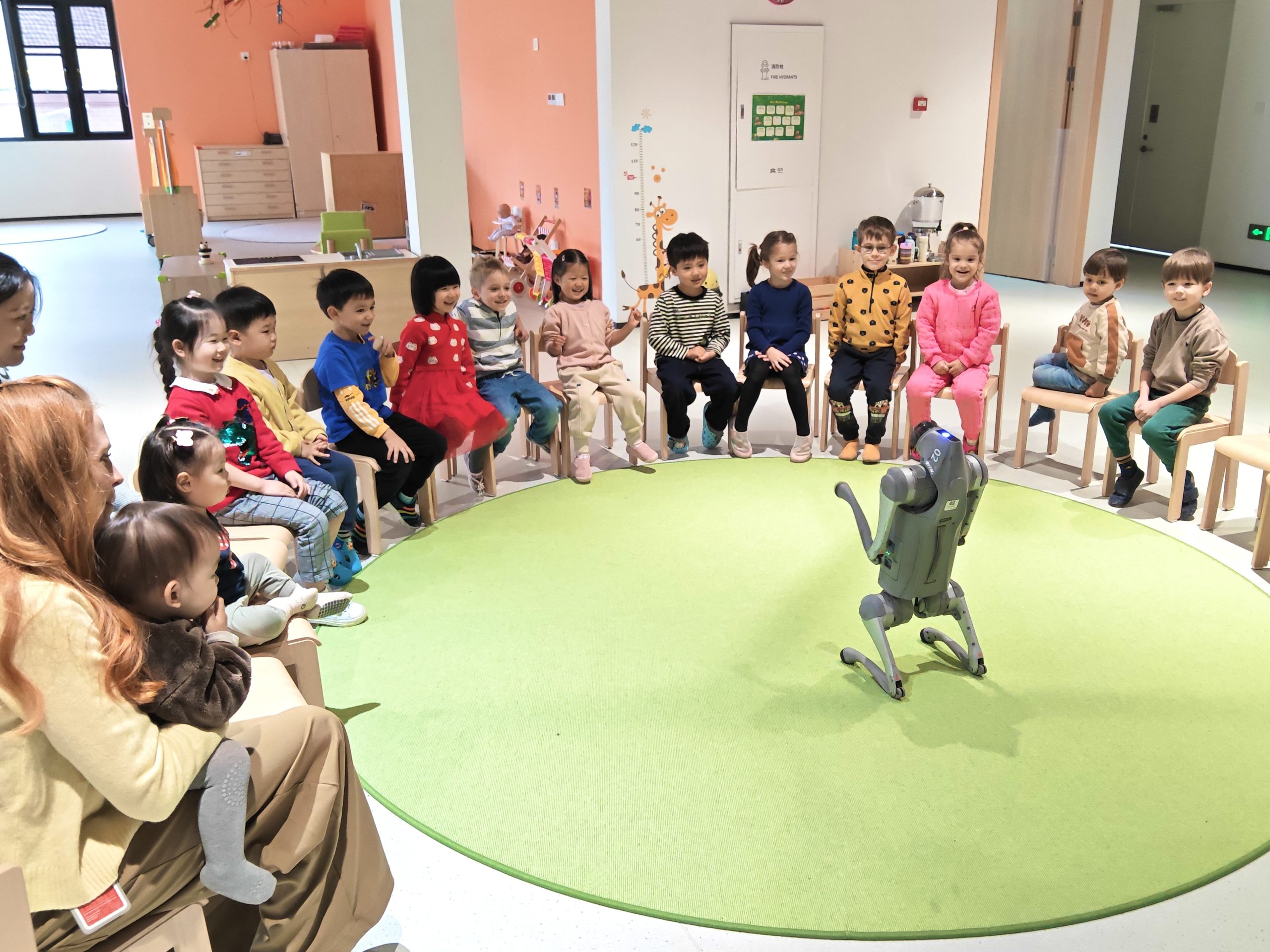 Die Kindergartenkinder waren begeistert, als sie letzte Woche einen ganz besonderen Gast empfingen: einen echten Roboterhund! Mit großen, staunenden Augen verfolgten sie jede seiner Bewegungen. Ganz leise konnte er sich hinsetzen, dann wieder fröhlich springen oder sogar eine kleine Tanzbewegung machen. Die Kinder klatschten vor Freude!