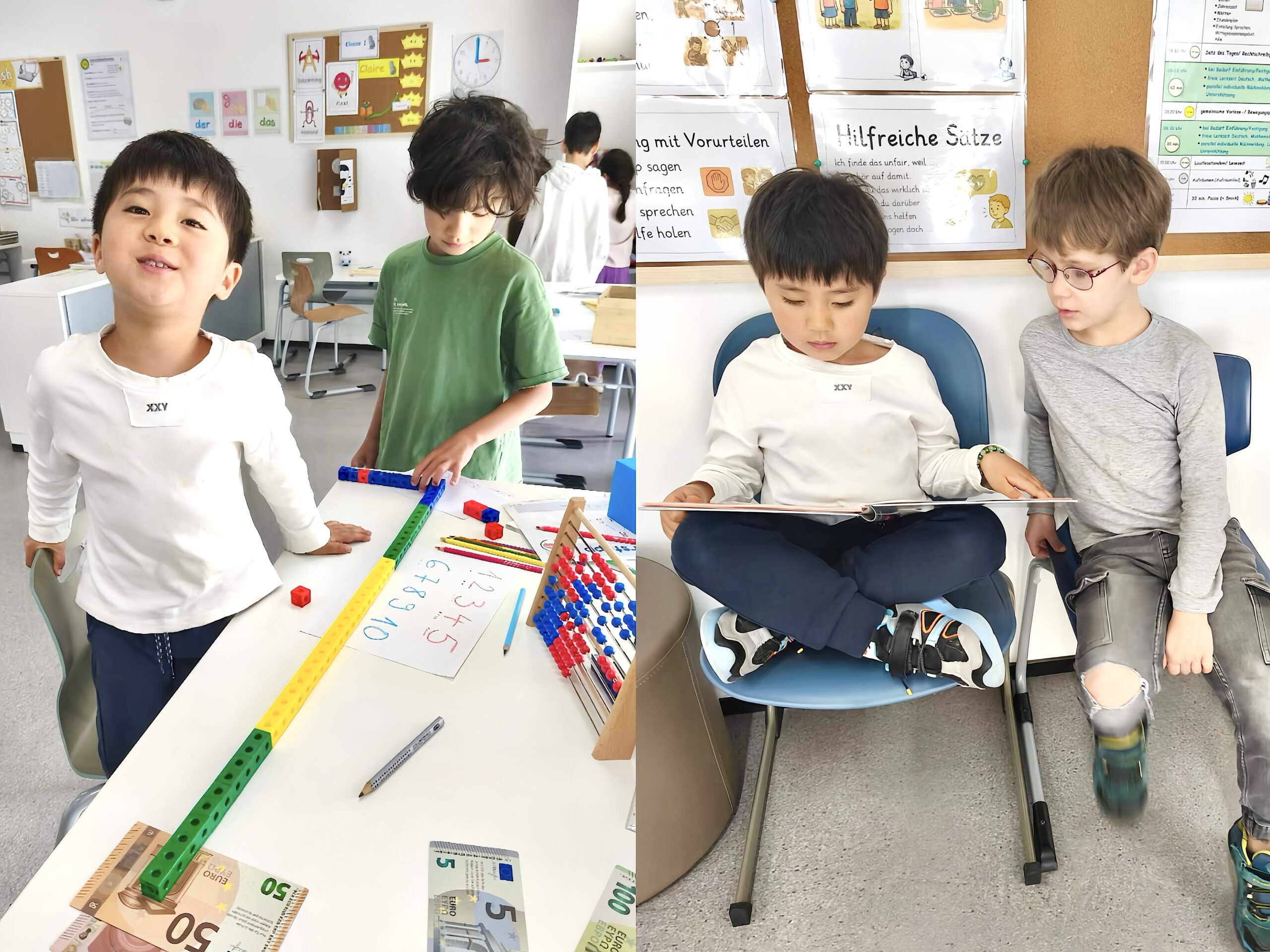 The first graders enthusiastically took on the role of “little teachers,” guiding the preschoolers with patience and a great sense of care. They introduced letters, supported them in writing their names, and practiced early writing skills. In mathematics, they worked together with numbers up to 10, using familiar materials such as counting frames and linking cubes. In science, the children discovered the human skeleton together and gained exciting insights into how the body is built.