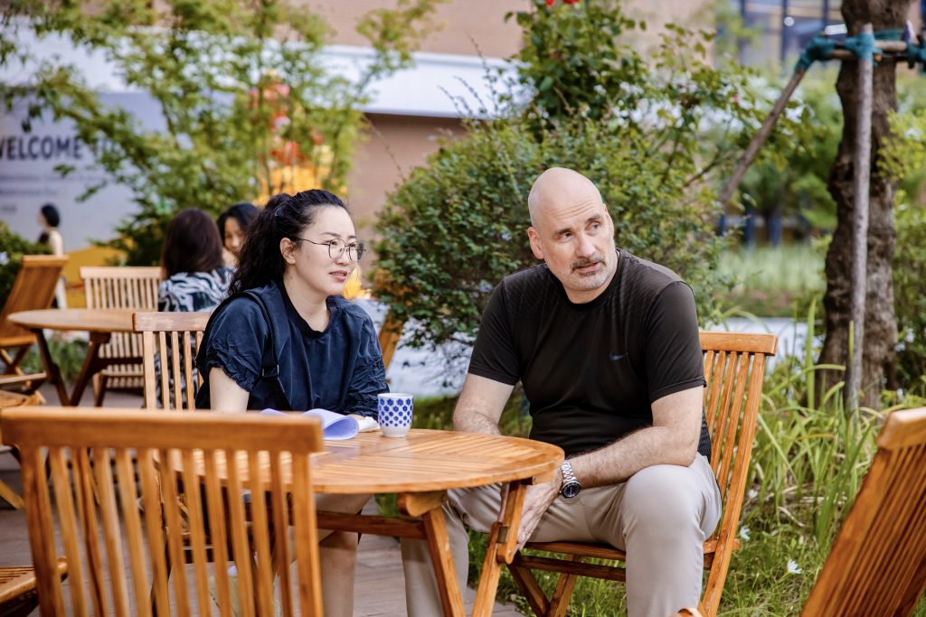 In fact, this school restaurant, with its outdoor terrace and view of the green garden, feels more like a truly contemporary co-working space with a cafeteria. Traditional Chinese elements were partly incorporated into the modern design.