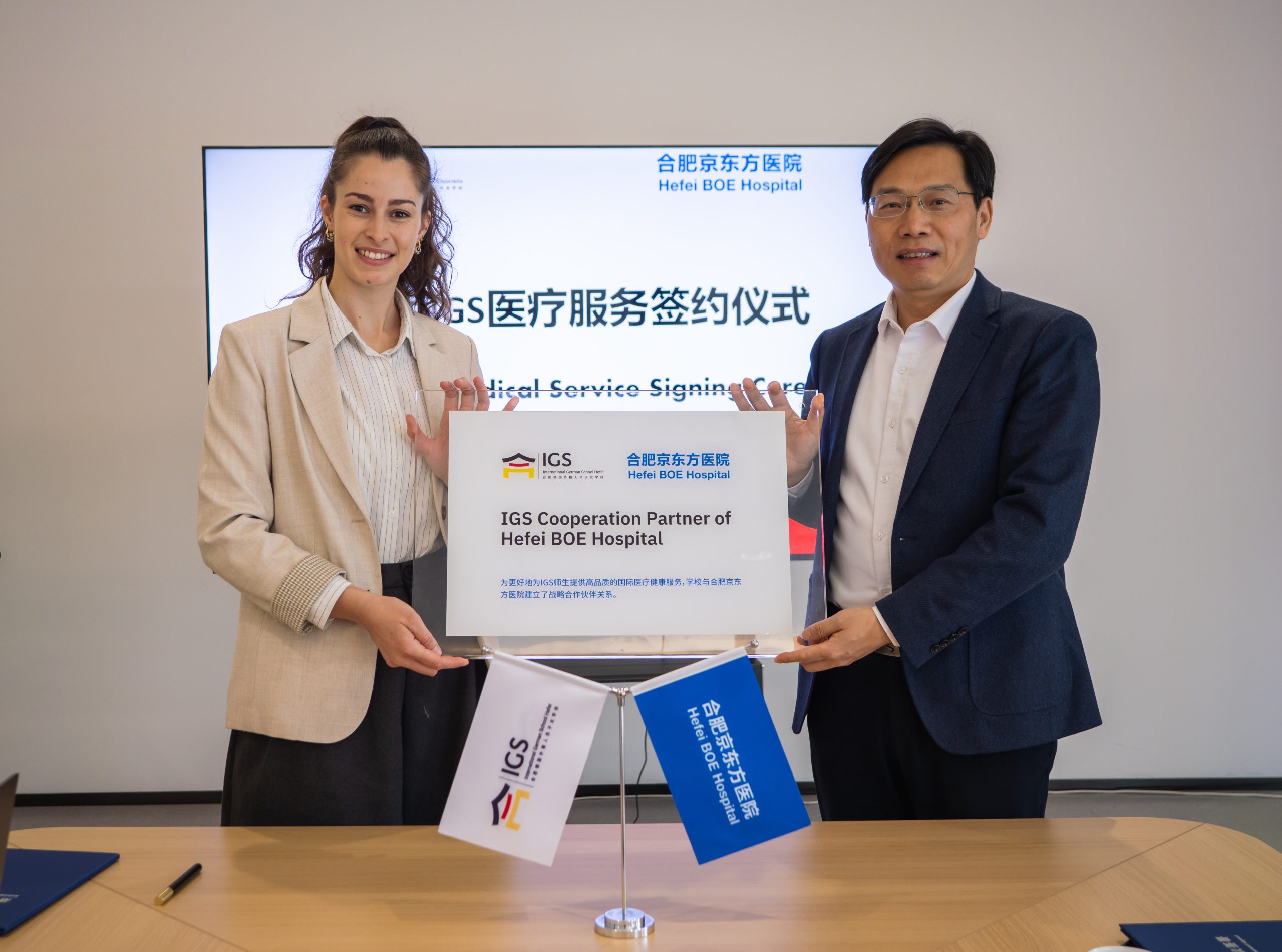 为进一步提升校园医疗健康服务品质,为全体师生打造更安心、更优质的学习与工作环境,1月16日,我校与合肥京东方医院正式举行战略合作伙伴授牌仪式,携手开启校园健康服务新篇章。IGS-HF执行总裁吴晶晶女士、幼儿园园长Rebecca Rohrmeier女士,合肥京东方医院合肥京东方医院党委书记、院长何仿先生,党委副书记、企划部部长刘凯先生出席仪式,共同见证这一重要时刻。